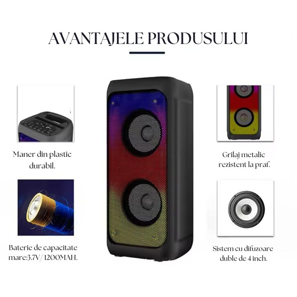 Functii: Bluetooth, Redare card TF/USB, Radio FM, Funcție Karaoke, AUX