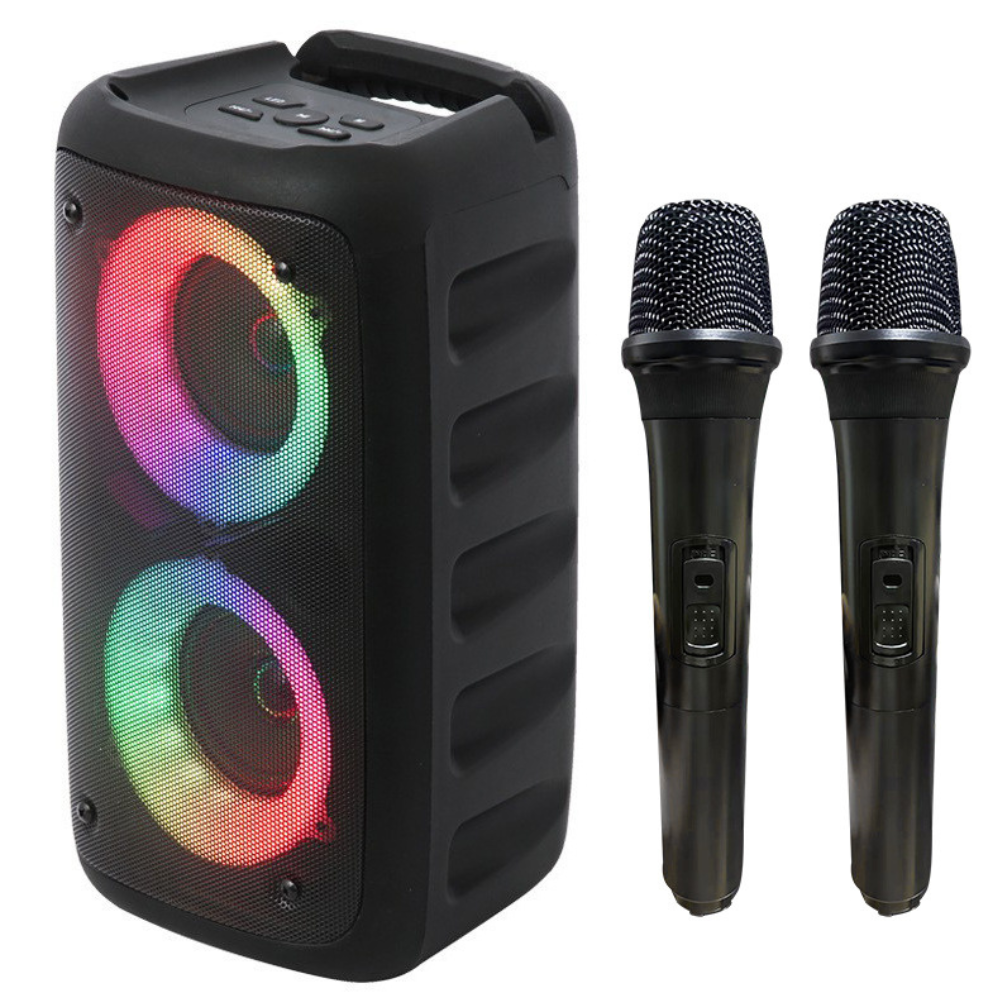 Duet Fără Fir: Boxa vine cu două microfoane wireless incluse, perfecte pentru sesiuni de karaoke în pereche, prezentări sau jocuri cu prietenii.