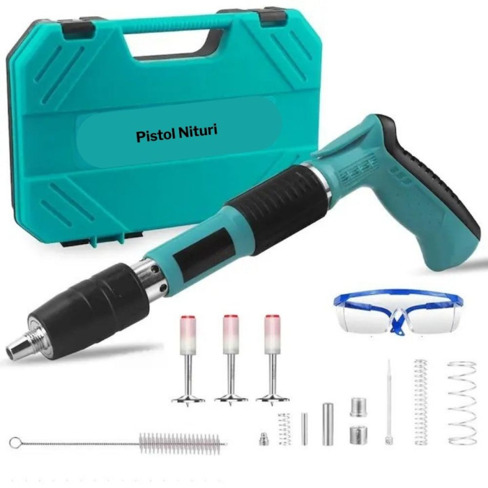 Continut pachet: 1x Pistol de nituri pneumatic manual, 1x Pereche de ochelari de protectie, 1x Trusa de depozitare si transport, Perie de curatare