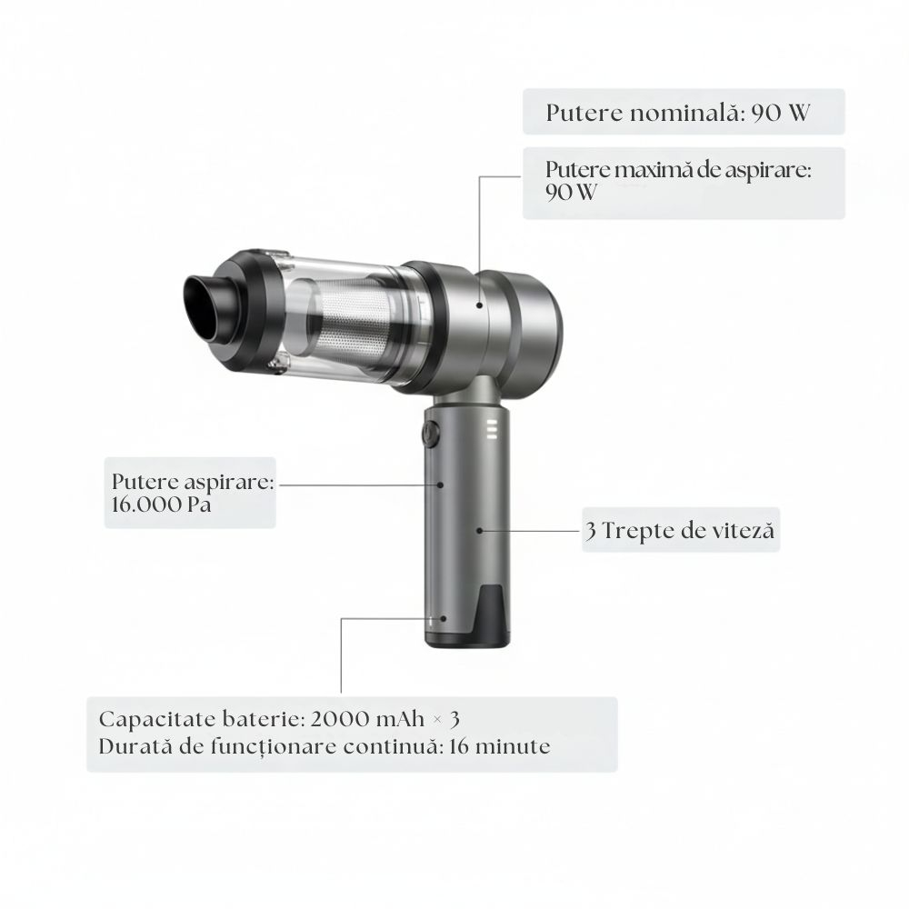 Suflanta de aer electrică cu funcție de aspirator 4-în-1 este un dispozitiv puternic, versatil și fără fir, creat pentru curățarea eficientă a prafului și murdăriei din zone greu accesibile. Combină suflarea de aer de mare presiune cu aspirarea puternică de până la 16.000 Pa, fiind ideală pentru întreținerea electronicelor, a interiorului auto și a locuinței. Motorul fără perii (brushless) oferă performanță constantă, consum redus de energie și o durată de viață semnificativ mai mare comparativ cu motoarele clasice. Nivelul redus de zgomot permite utilizarea confortabilă chiar și în spații închise sau la birou. Dispozitivul este alimentat de un acumulator puternic format din 3 baterii de 2000 mAh, care asigură o autonomie de până la 16 minute, suficientă pentru o curățare completă fără întreruperi. Designul compact, ergonomic și ușor permite manevrarea cu o singură mână și depozitarea facilă în torpedou, sertar sau rucsac. Funcția 4-în-1 transformă acest aparat într-un ajutor indispensabil: