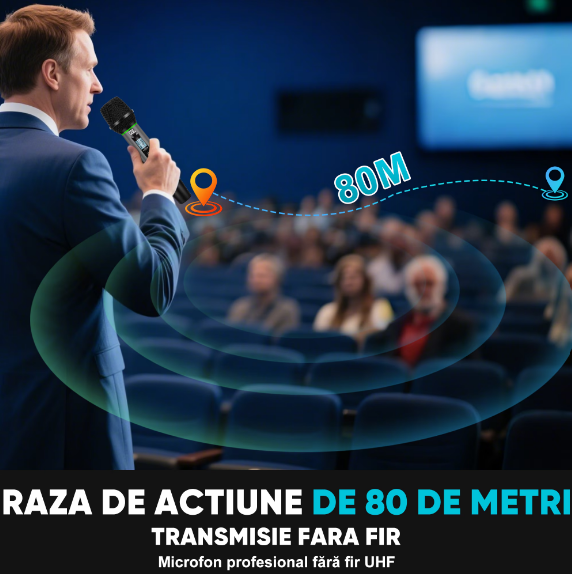 Uită de cablurile încurcate și de întreruperile enervante! Sistemul nostru de microfon wireless UHF are un design unic cu antenă dublă, care îi amplifică semnificativ capacitățile anti-interferențe. Semnalul este extrem de fiabil, iar tu nu trebuie să-ți faci griji cu privire la întreruperea sunetului în timpul utilizării. Bucură-te de o rază lungă de transmisie de până la 80 de metri în spații deschise, oferindu-ți libertate totală de mișcare!